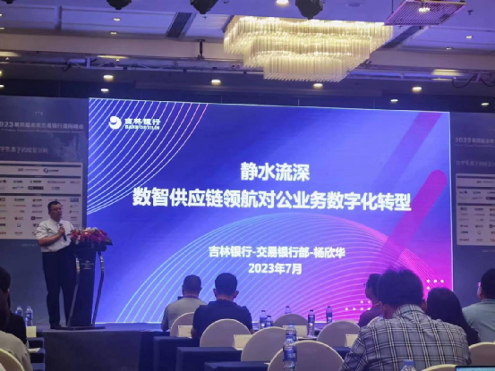 会上,总行交易银行部总经理杨欣华代表吉林银行,做了题为《静水流深-数智供应链领航对公业务数字化转型》的报告,向参会人员介绍了吉林银行在交易银行业务的发展情况,从建设数智供应链服务平台、构建大数据风控能力、建立灵活高效的产品运营机制、搭建特色化金融服务场景四个方面为切入点,分享了吉林银行在数智供应链业务领域的探索和实践,并就粮食银行及吉运链的数智供应链金融业务案例进行了阐述,得到与会代表对吉林银行数智供应链领航对公数字化转型予以高度的肯定及赞誉。