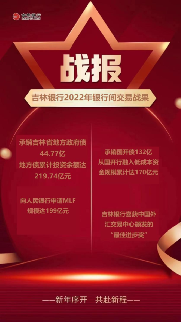 2022年12月30日,中国外汇交易中心暨全国银行间同业拆借中心公布了2022年度获得“年度市场影响力奖、市场创新奖和最佳进步奖”银行名单,吉林银行喜获“最佳进步奖”。