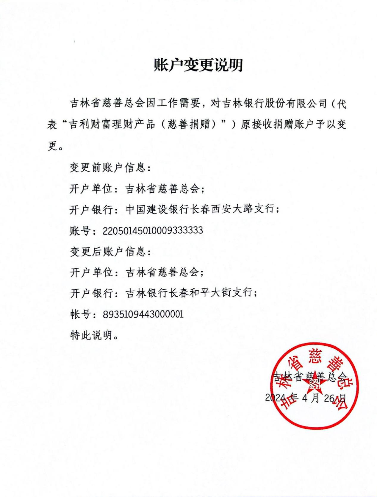 吉林省慈善总会因工作需要,拟对吉利财富慈善捐赠理财产品原接收捐赠账户予以变更,变更内容如下: