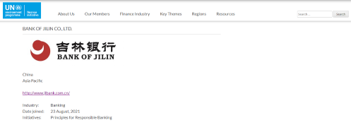 2021年8月23日,吉林银行签署联合国《负责任银行原则》(PRB,Principles for Responsible Banking),正式加入联合国环境规划署金融倡议(UNEP FI)。目前,中国地区签署PRB的银行仅14家。成为东北地区首家签署《负责任银行原则》的银行。